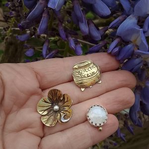 Duo de broches « Witchy » en bronze ciselé et pierre de lune