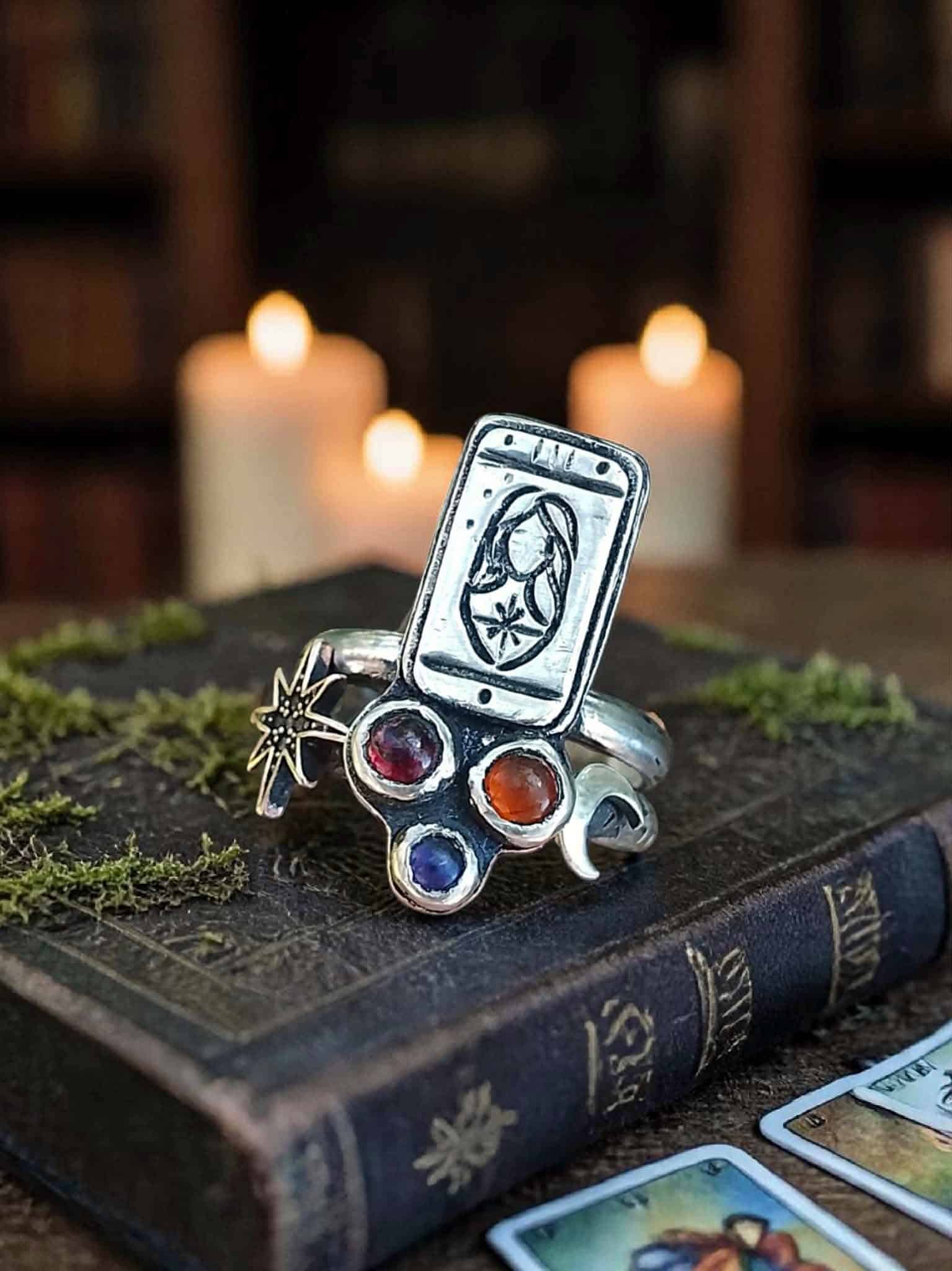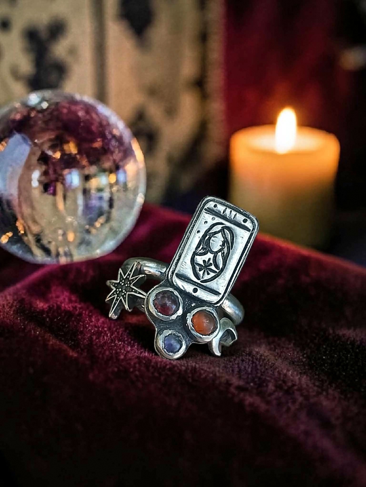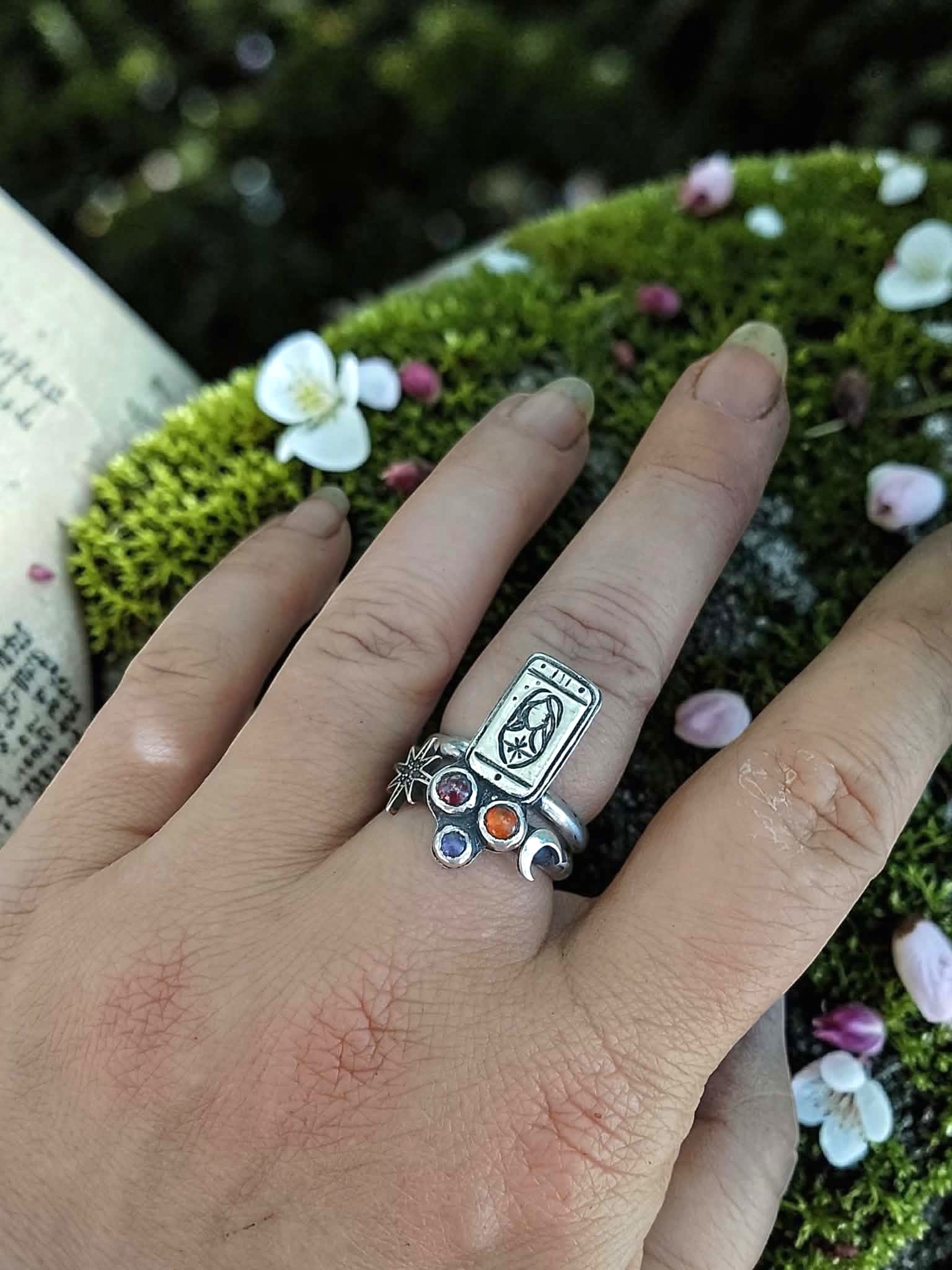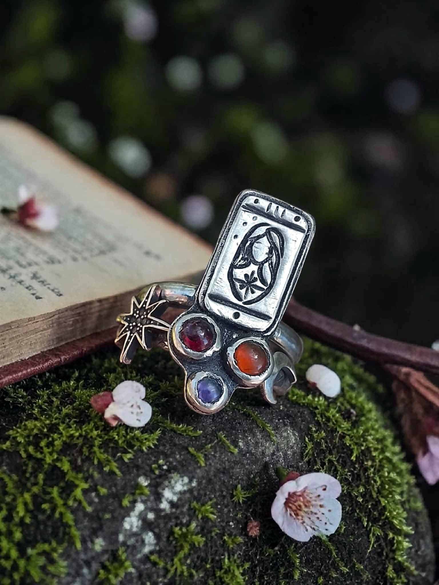 Duo de bagues « L’impératrice » en argent et pierres (Grenat, cornaline et améthyste) serties à la main.