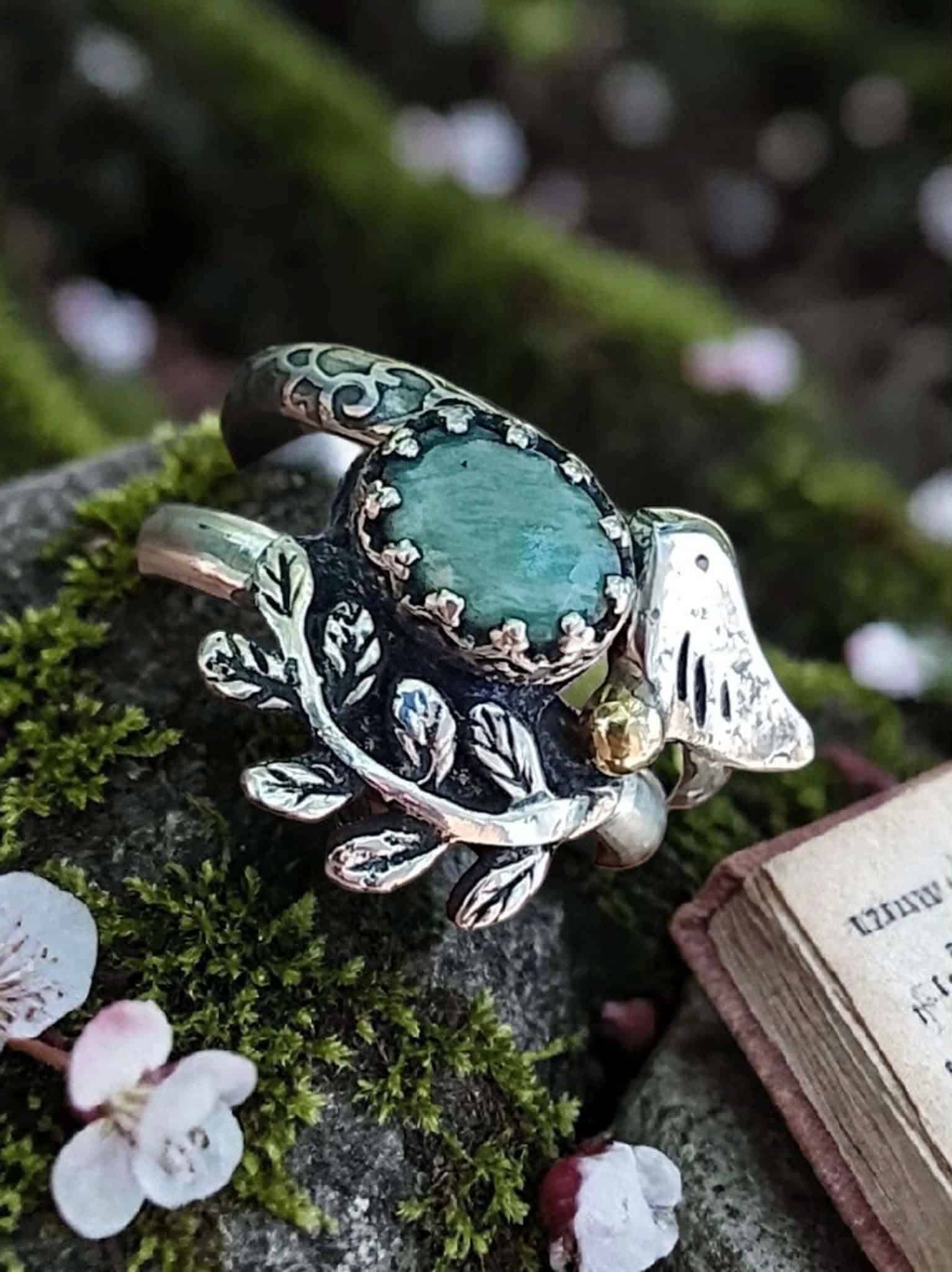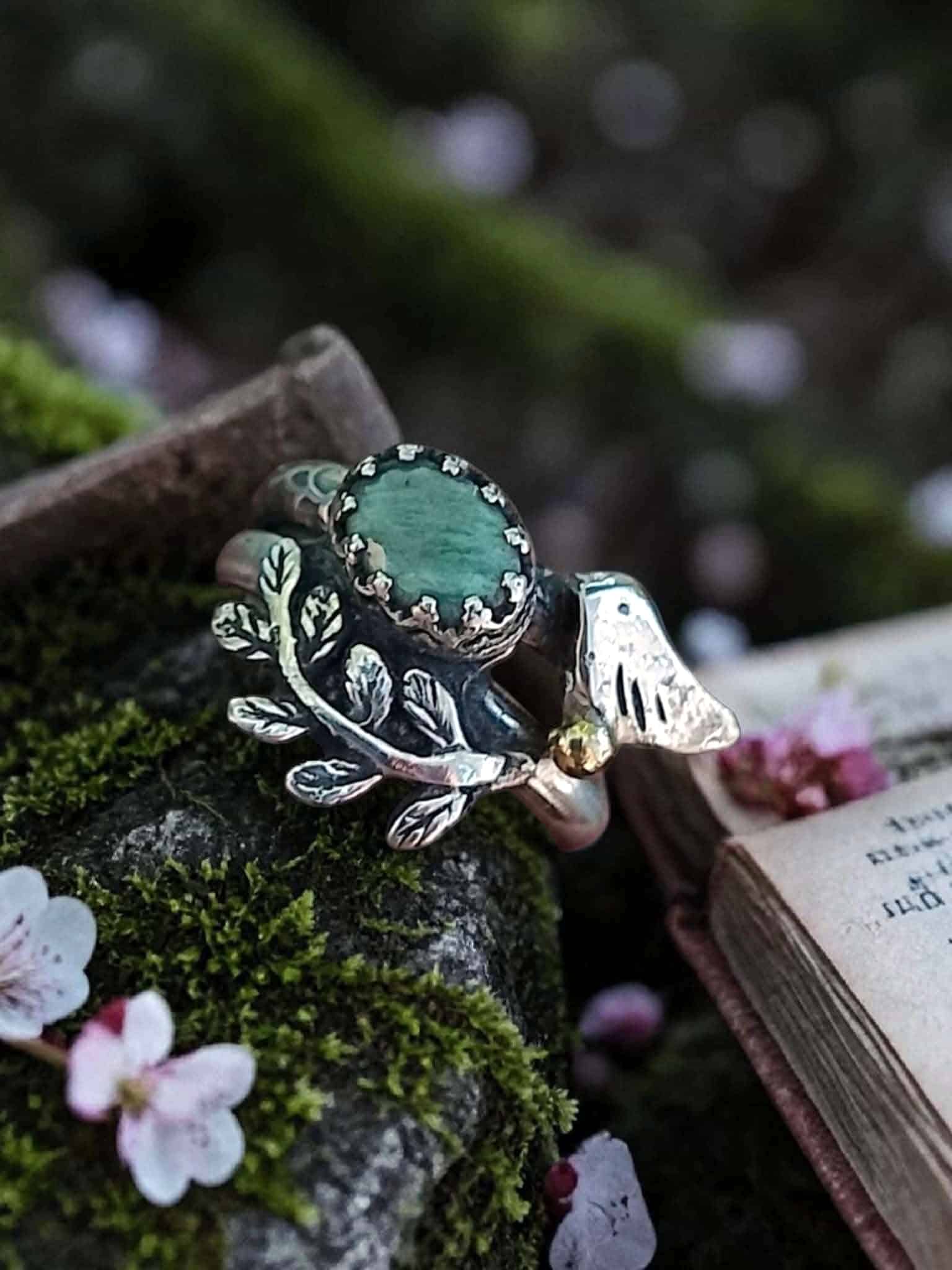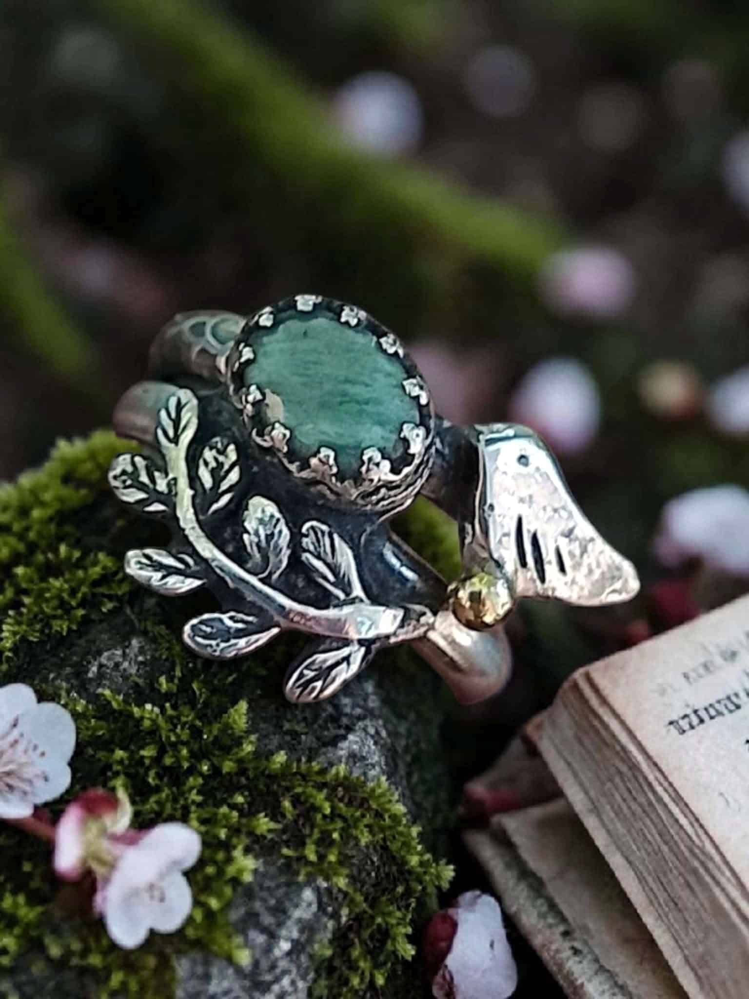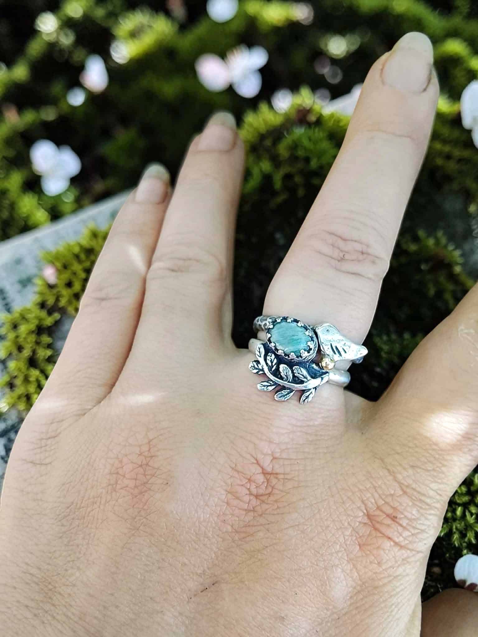 Duo de bagues « Magie végétale » en argent et amazonite sertie à la main.