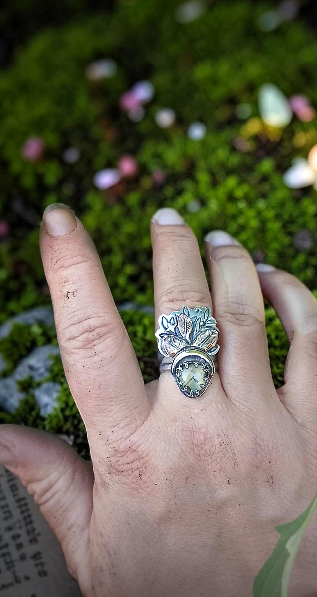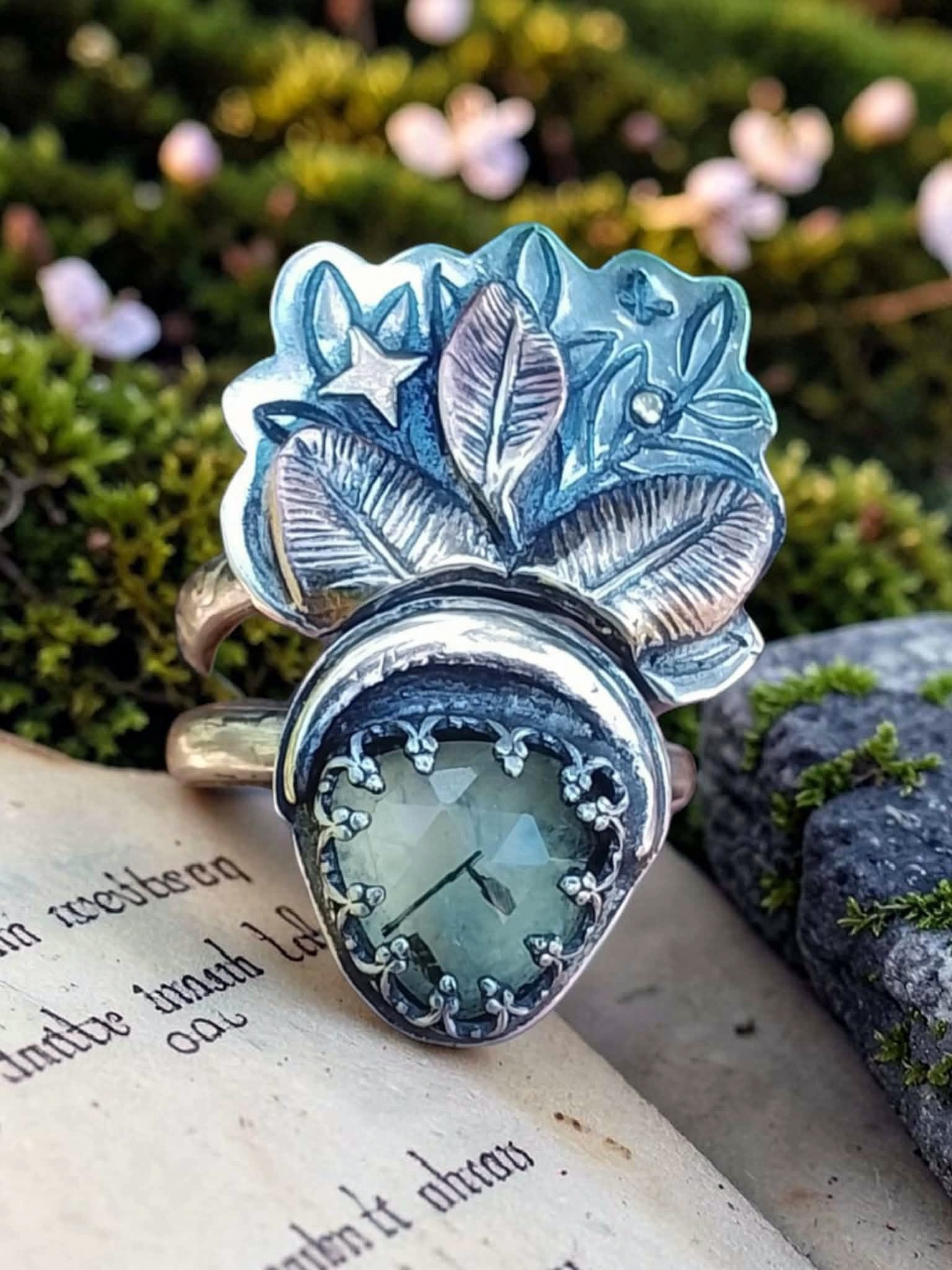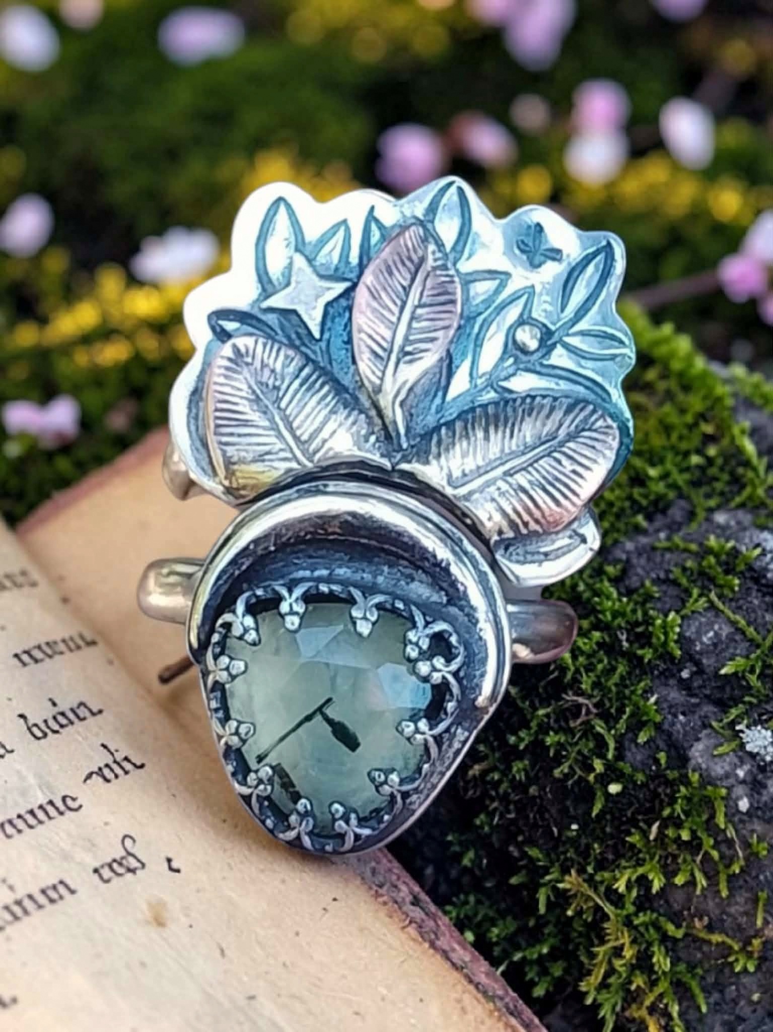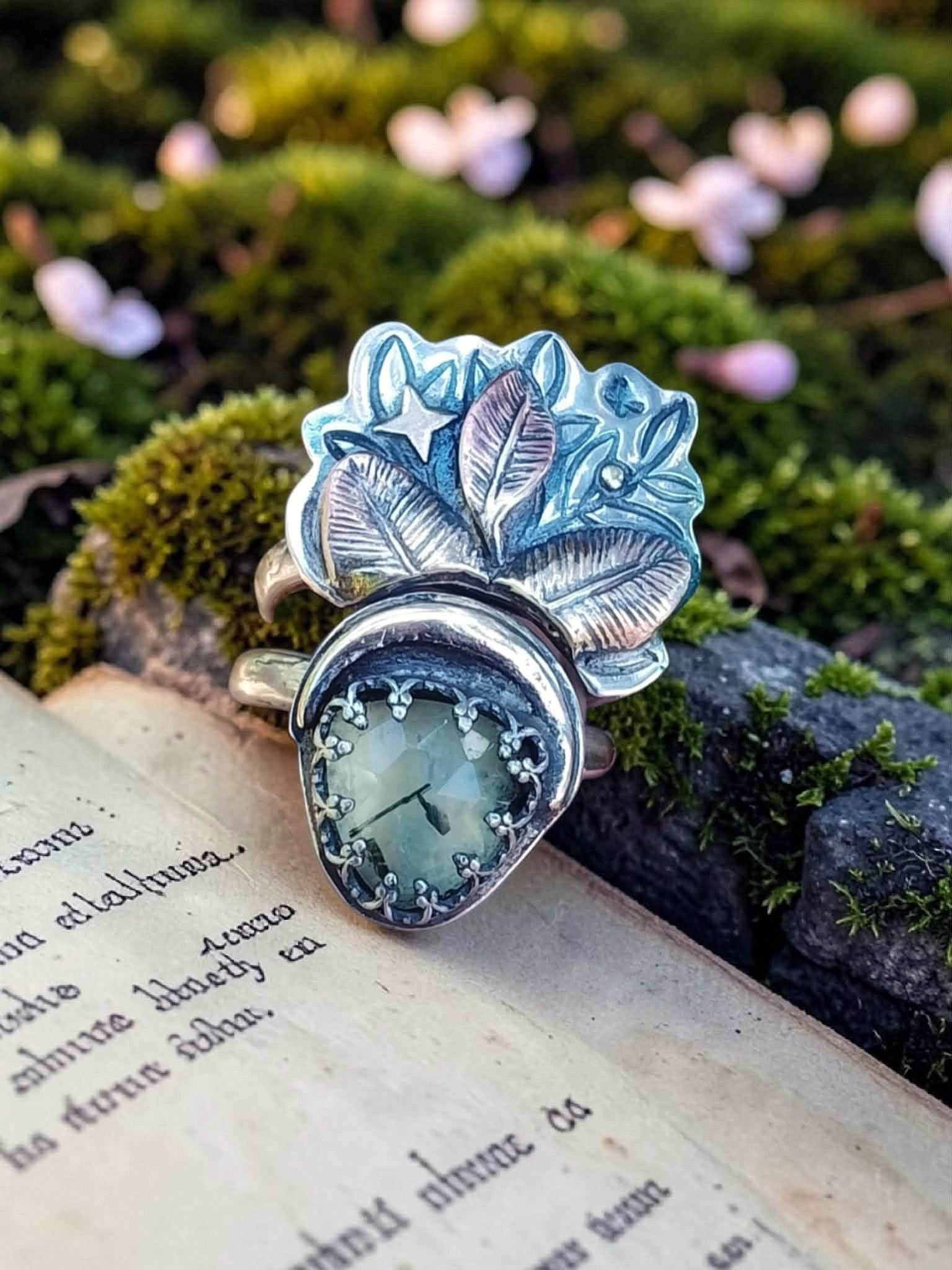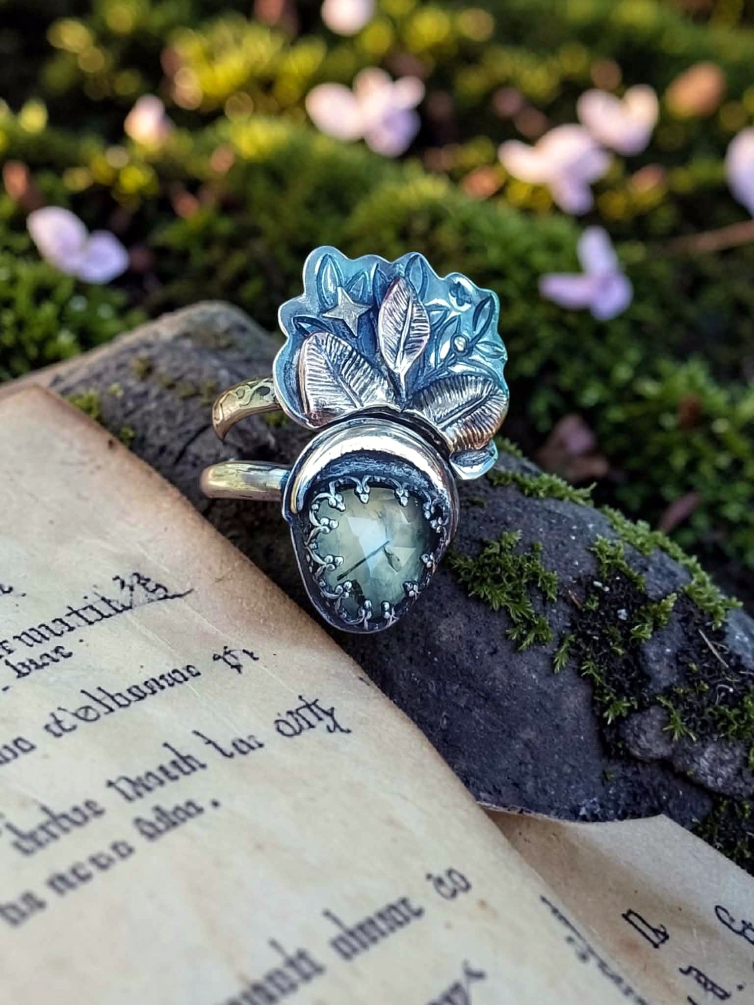 Duo de bagues « Magie végétale » réglables en argent et prehnite sertie à la main.